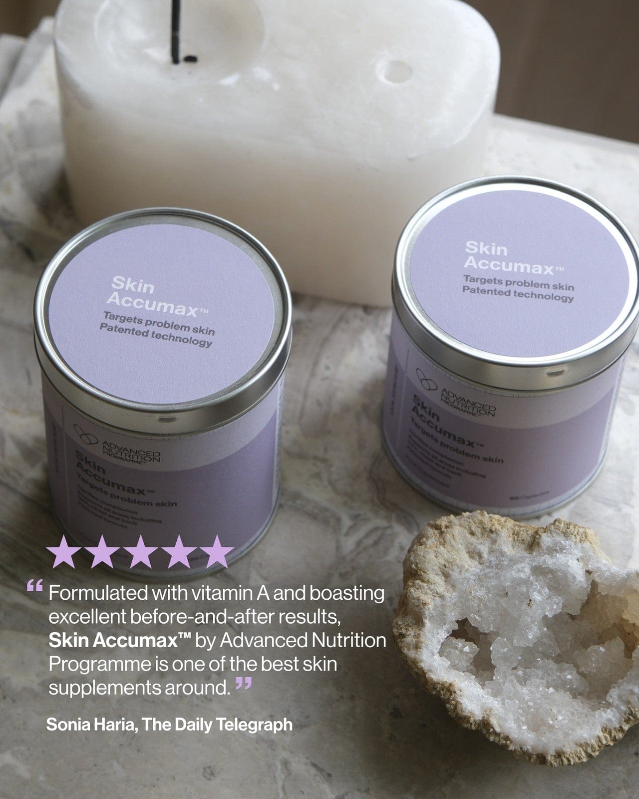 Do not take if you are pregnant, breast-feeding or planning a pregnancy. If you are under medical supervision, please consult a doctor before use. In the very unlikely event of an adverse reaction to Skin Accumax™ we recommend that you stop taking the product. If problems persist please consult your medical practitioner. Keep out of sight and reach of children. This product should not be used as a substitute for a varied and balanced diet and healthy lifestyle. Do not exceed the stated recommended daily intake. Store below 25°C in a dry place away from direct sunlight and heat.